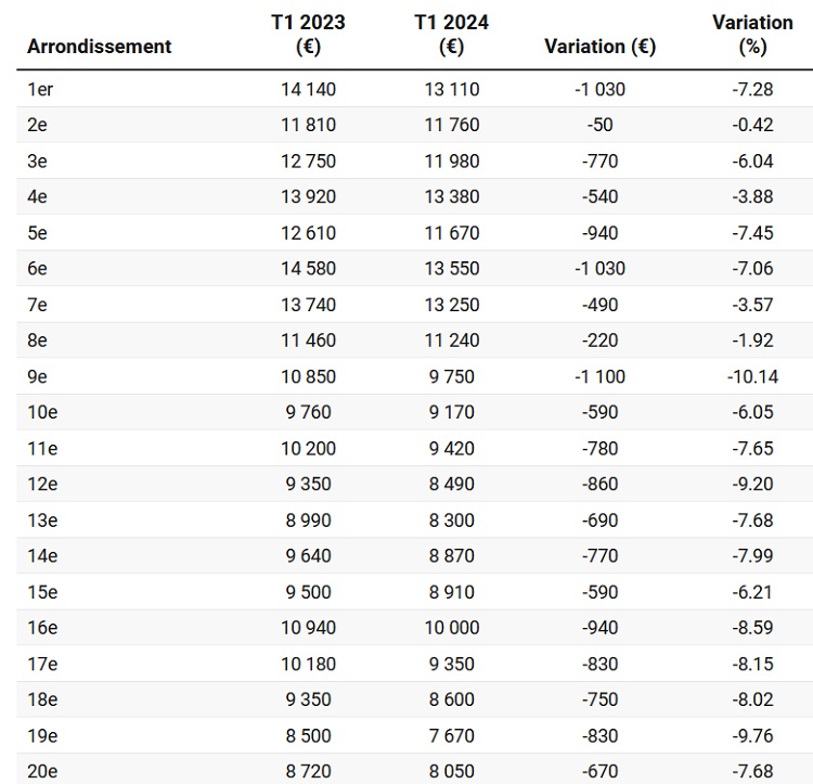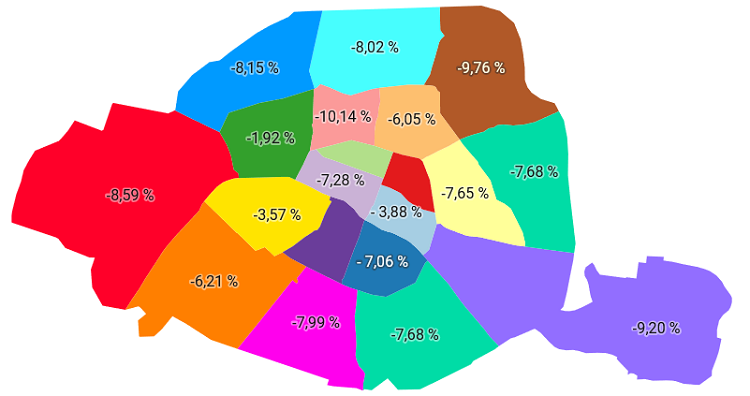 Largest falls this year have been in the 9th district, by -10%, to reach €9,750/m2. A similar fall was recorded in the 19th and 12th districts of -9.7% and -9.2% respectively.
