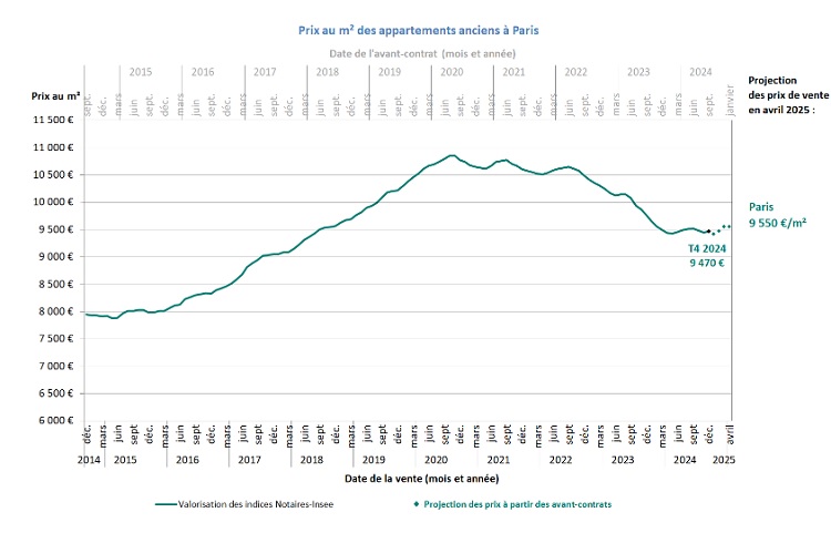 The graph below shows the average price of apartments over the past 20 years. The average price at the end of 2024 was €9,470m2, down -3% in a year. The notaires are projecting a 1% increase in prices by the end of Q1/25. They consider that whilst lower interest rates have stabilised the market, international tensions and difficulties at home are weighing on buyers and sellers.