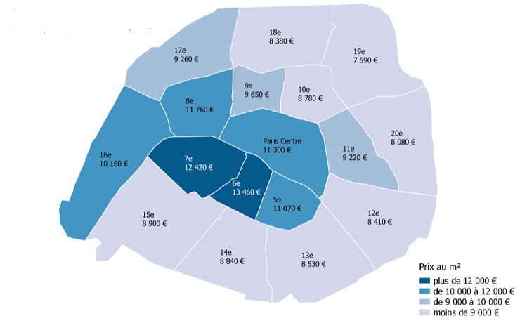 The final graphic below shows the prices at the end of the year for each district of the capital. The 6ème continues to be the most expensive (€13.460m2 on average), whilst the 19ème props up the table at €7,590m2.
