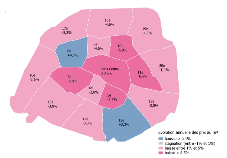 As can be seen below, the movement in prices was not uniform across the capital. Highest fall in prices was in Paris Centre (-10.5%). In the 8ème prices rose by +4.7%, and by +2.3% in the 13ème.