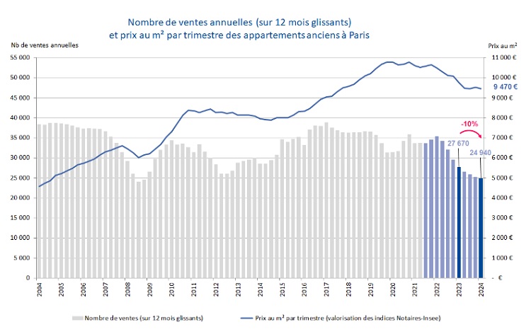 In their recently published report on the residential property market in Paris for last year the notaires state that sales of apartments fell by -10% compared to 2023 and by -30% in comparison with 2022. Prices also fell by an average of -3%.