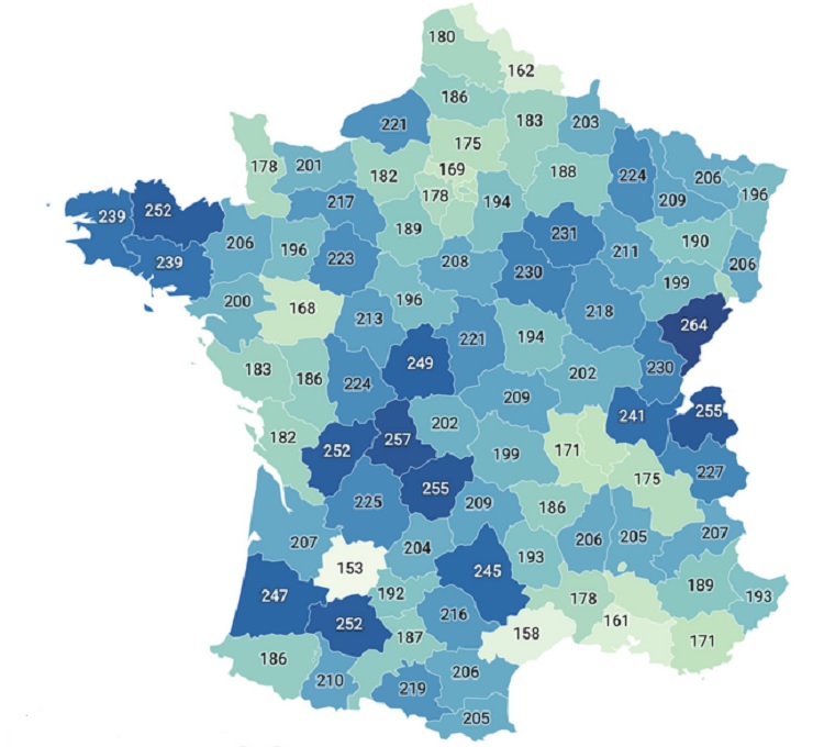 The researchers found that the average price for a house measuring up to 120m2 was €203. The minimum price was again in the Bouches-du-Rhône (€83) and it was likewise Paris with the highest price at €620. The graphic below shows the average price by department.