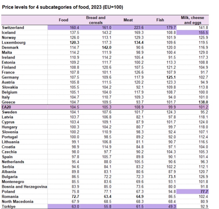 If beverages (including alcohol) and tobacco are removed, France moves up the table to 10th place. The price of fruit and vegetables (not shown in table) is particularly expensive in France, 17 points higher than the average in the EU, the 5th highest in the study. The same is true of the price of meat, nearly 27 points higher than the EU average, once again the 5th most expensive in Europe. In contrast, the price of dairy produce and 'other' food is lower than the European average.