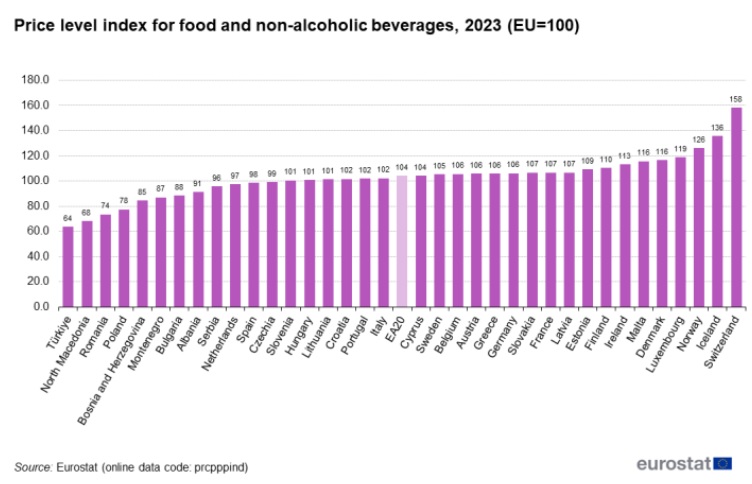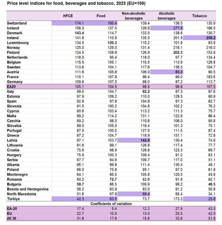 As might be expected, highest prices are in Switzerland, alongside several Nordic countries, and Luxembourg, Malta and Ireland.