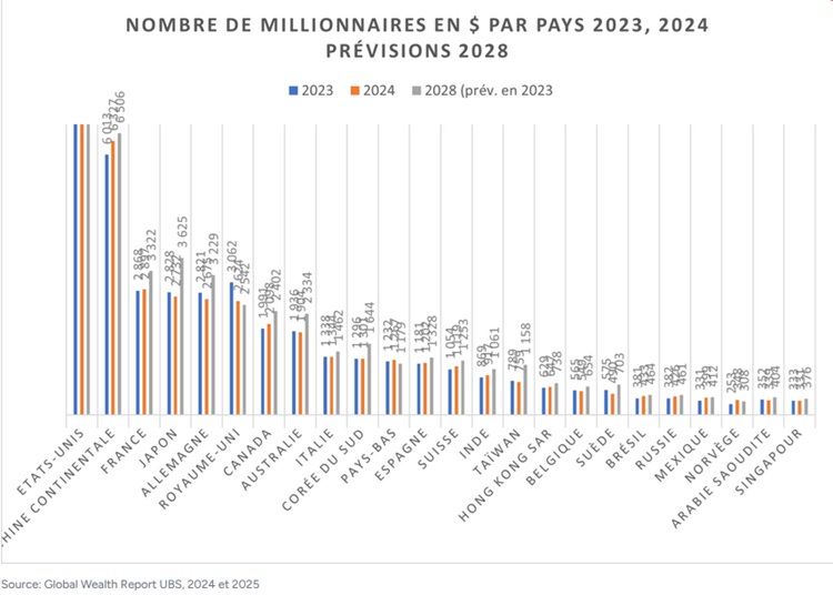 According to the latest statistics from UBS (Global Wealth Report 2025), in 2024 France had nearly 2,897 $1million millionaires, placing it 3rd globally behind China (6,5 million) and the United States (23,8 million), but ahead of the United Kingdom (2,624 million) and Germany (2,689 million).