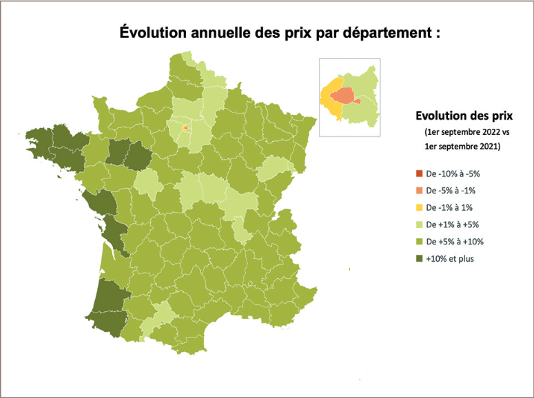 FNAIM provide more up to date figures to September 2022, but they are by no means definitive. Like the notaires they consider prices in Paris have fallen (-3.0% year-on-year), whilst in almost all other areas prices increased over the year.