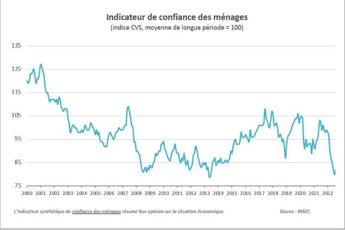 Accordingly, perhaps the most useful indicator of the outlook is the regular survey undertaken by the national statistics office INSEE into the level of household confidence, which is at its lowest for over 20 years, as shown on the graphic below.