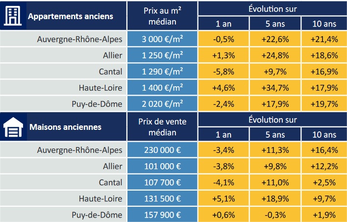 As can be seen, prices in Auvergne are well below the regional average, with lowest average house prices in the department of Allier (€101,000).