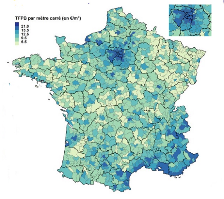 The graphic below shows the average level of the rates for homes per square metre. According to the report, on a national level it is €12.5m². Once again, however, there are significant local variations. It is over €20m² in Paris, whilst in some areas it is below €6.5m². In large measure this is a reflection of the difference in local property values.