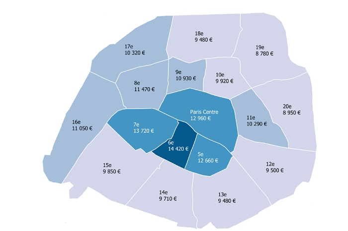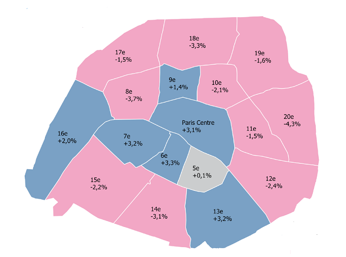Strongest price growth of +3% occurred in the central districts (arrondissements) save for the 5th, where prices remained stable. Price falls of up to -4.3% were observed in the outer districts.