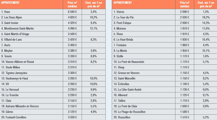 The graphic below shows prices for apartments in the top 20 most expensive communes and the top 20 cheapest communes, together with the price movements in the year.