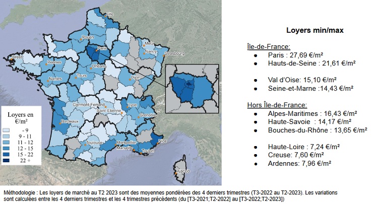 The graphic below shows average rents in each department, as well as minimum and maximum rents. Highest average rents are not surprisingly in Paris (€27.69/m²), whilst lowest rents are in Haut-Loire (€7.24/m²).