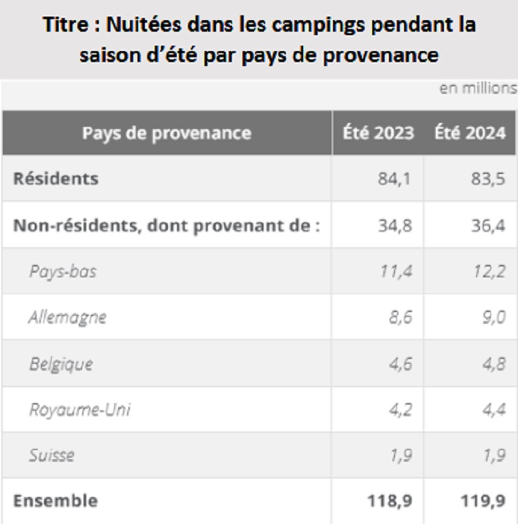During the summer season, over 30% of campsite visitors were from overseas, an increase of nearly +5% on 2023. The largest contingent was from Netherlands (12.2 million overnight stays), followed by Germany, Belgium and the United Kingdom (4.4 million overnight stays).