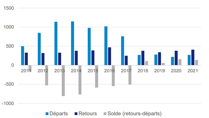 Since 2018 the number of departures has averaged 260 a year, a figure lower than the number of returners, which averaged 380 between 2018 and 2021.