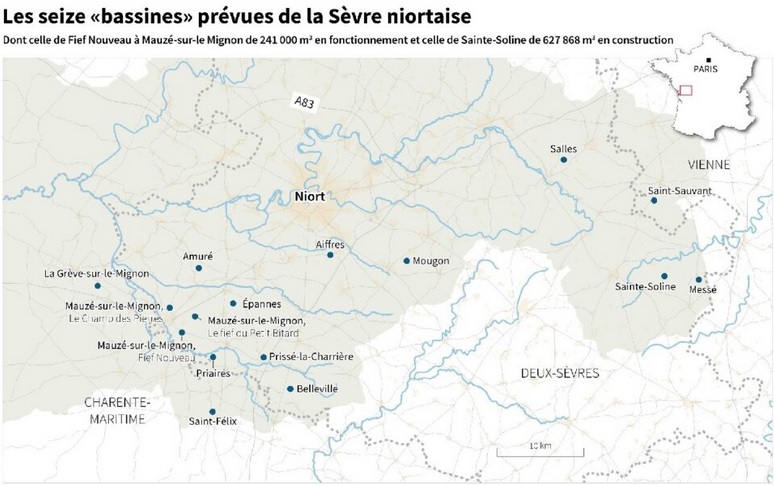 The plans for a reservoir at Sainte-Soline form part of a wider project approved by the government in 2018 for the construction of dozens of reservoirs in the departments of Deux-Sèvres, Vienne and the Vendée, as a defence against summer droughts.